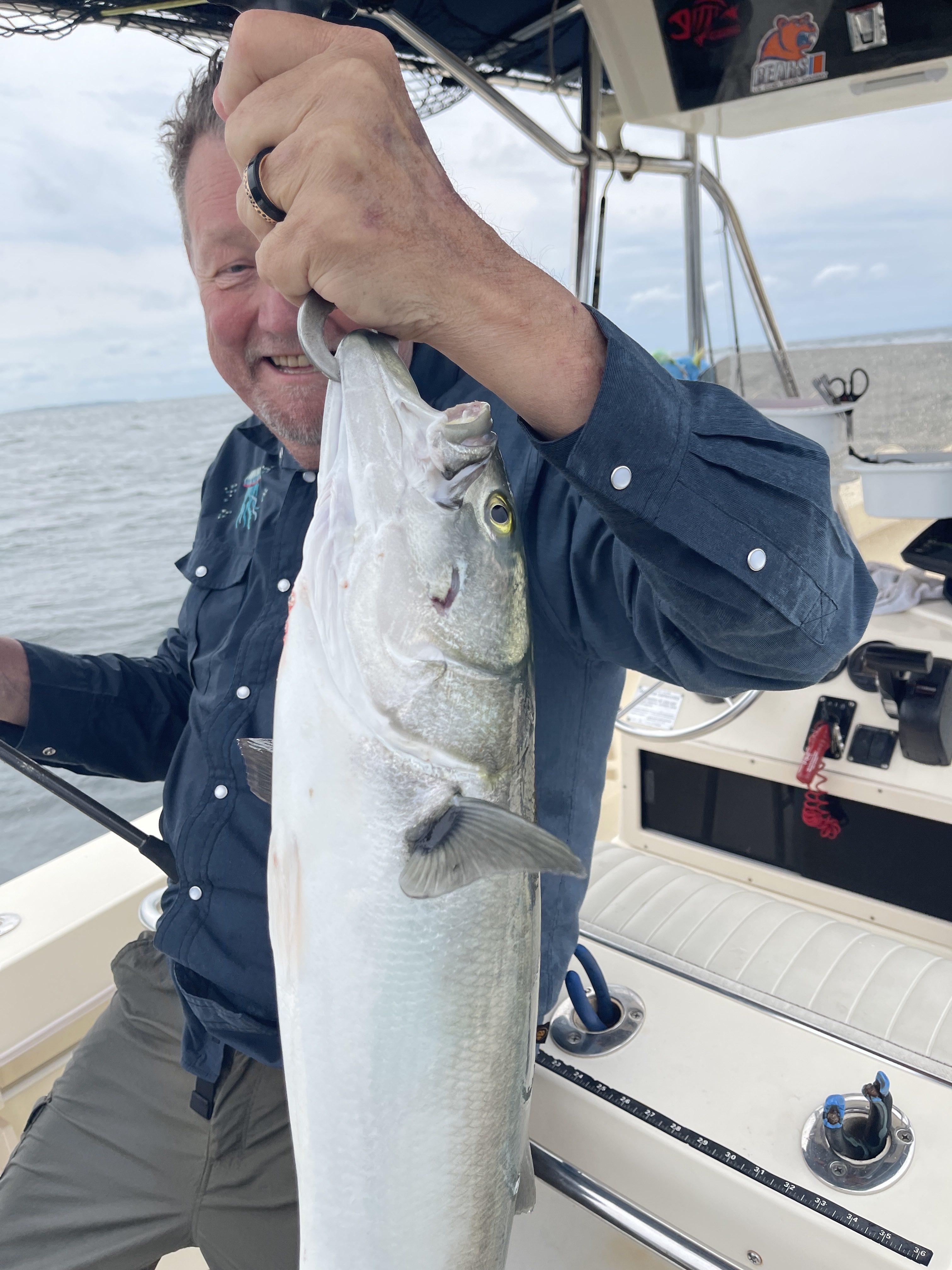 Fished with Stewart from Santa Fe NM yesterday. Stewart is one of my rare fishermen that’s more adept with a fly rod than he is with a spinning rod. Didn’t matter though as we were out for fish on the fly anyway. We made a run to Watch Hill as a pal told me an early run of Bonito has been seen there. Arrived at Watch Hill and didn’t see anything so we headed back towards New London and came upon lots of schooling Stripers. Mostly all these fish were slot sized fish and we were able to chase and fish them for a couple hours. Stewart ended up with LOTS of hookups on these beautiful fish. There were so many Stripers schooled up that if they didn’t eat the fly it didn’t matter as they would snag anyway. We were both in awe of all the fish and what a wonderful sight it was to see just so many of these great sporting fish. Once the tide stopped it was over so I headed west on the various reefs and actually the fishing only got better. Ran into some giant bluefish in the 15-20 lb class. Stewart landed one on the fly and 3-4 more on spinning rods. Kept heading West and took 4 drifts on one of my favorite reef and Stewart landed a nice Striper on each drift. Anyway….Big Stripers, huge Bluefish and a day we’ll both remember forever. WOW!!!